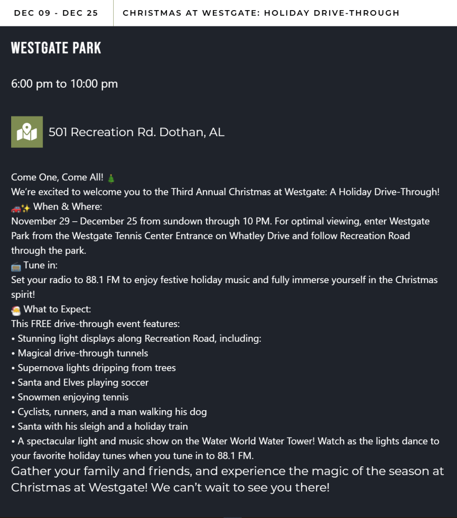 Holiday Events in Dothan Click Here https://visitdothan.com/things-to-do/events/#close December 8, 2024 0